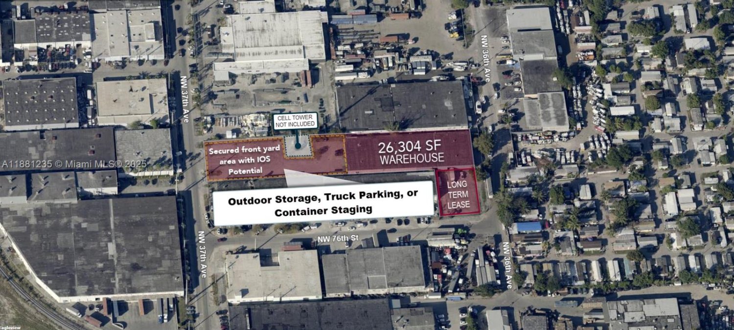 Lee & Associates presents an Industrial warehouse with IOS in the thriving Hialeah submarket—a rare opportunity to capitalize on Miami-Dade’s highly constrained IOS market. Situated on a 1.72 acre lot (74,734 SF across two adjacent folios) with an existing ±26,304 SF warehouse, the property features a secured ±34,659 SF front yard area that can be enhanced for outdoor storage, truck parking, or container staging. With industrial zoning that supports storage and logistics uses, the site is well-positioned to meet the strong tenant demand for IOS in this submarket. Investors can unlock additional value by formalizing the outdoor yard with fencing, surfacing, and screening, creating a dual-income play that combines traditional warehouse tenancy with premium IOS land rents.MLS #: A11881235